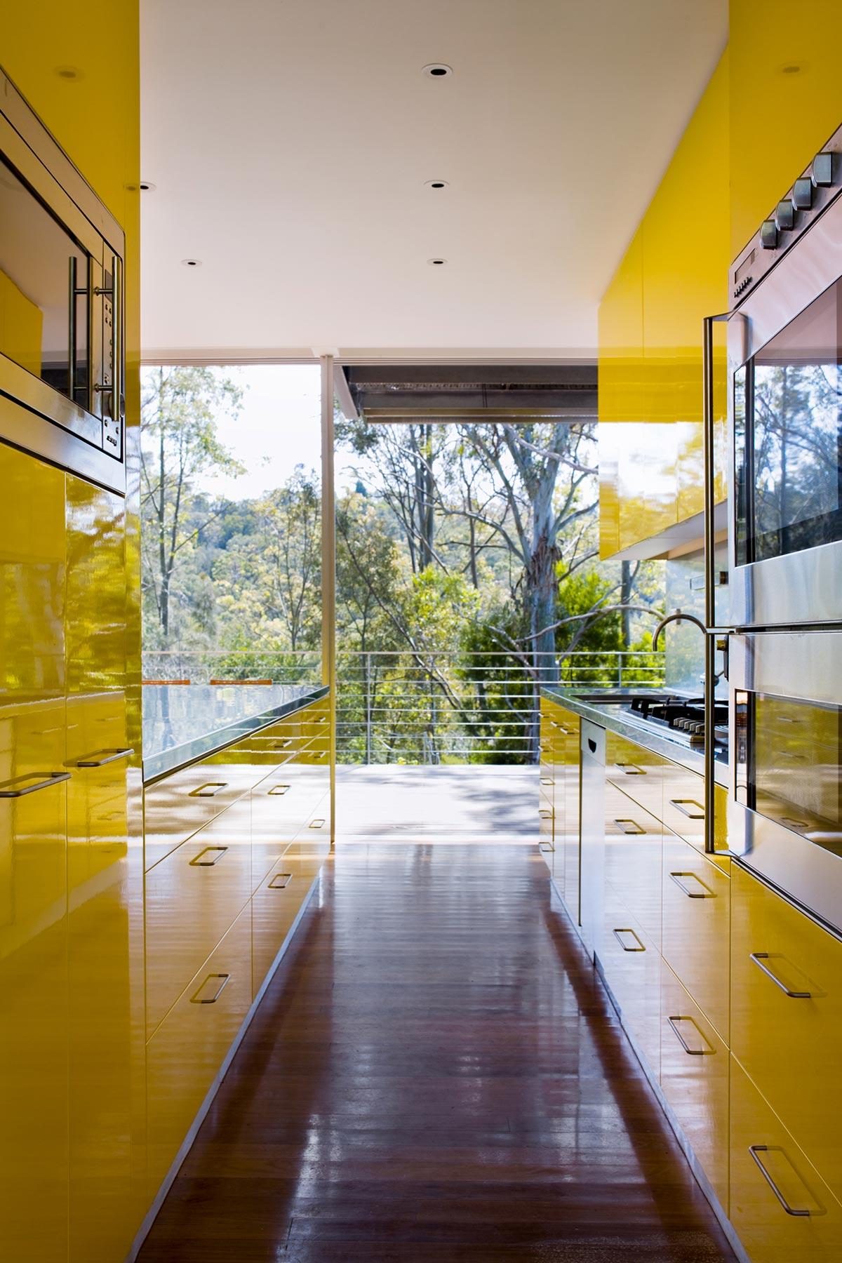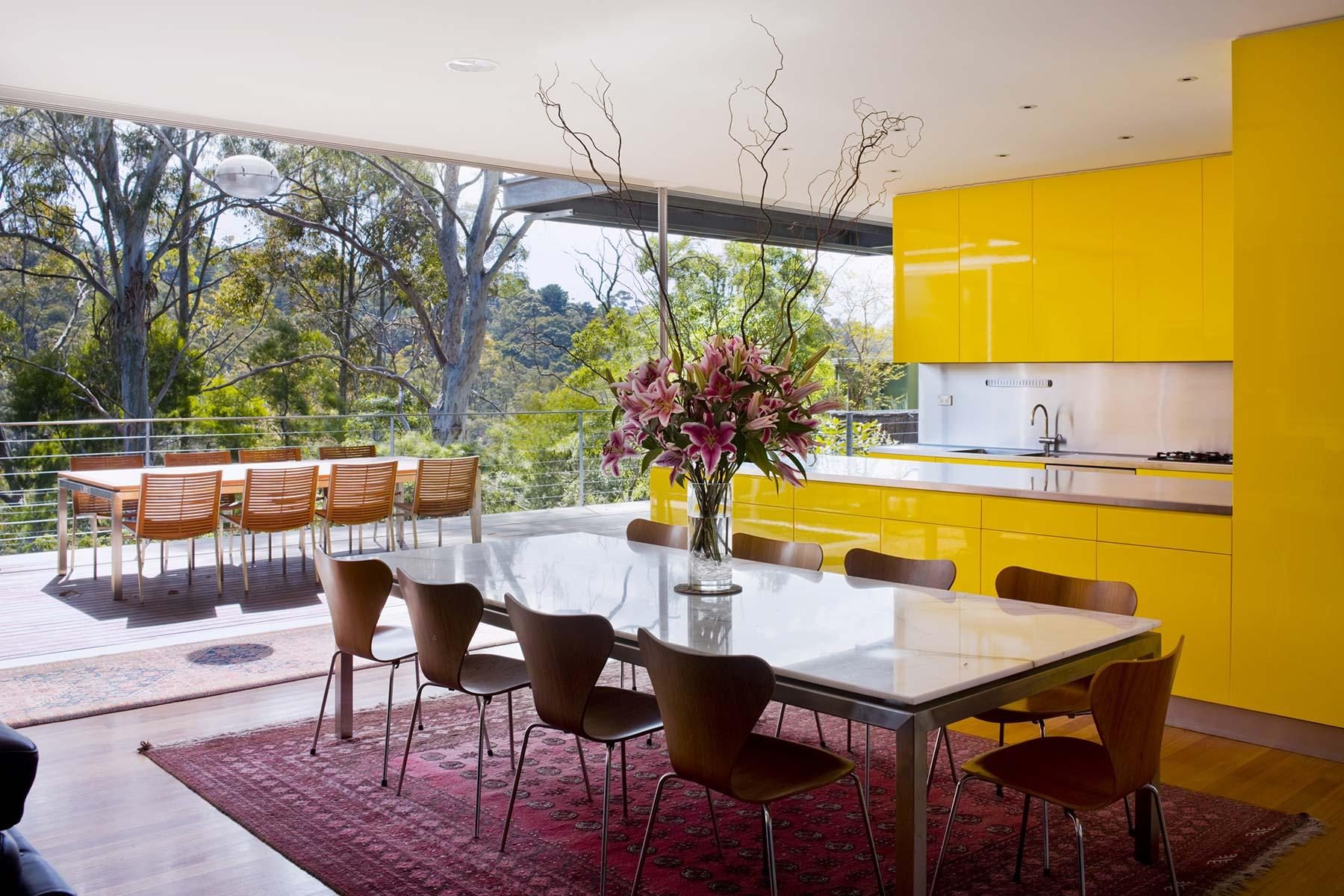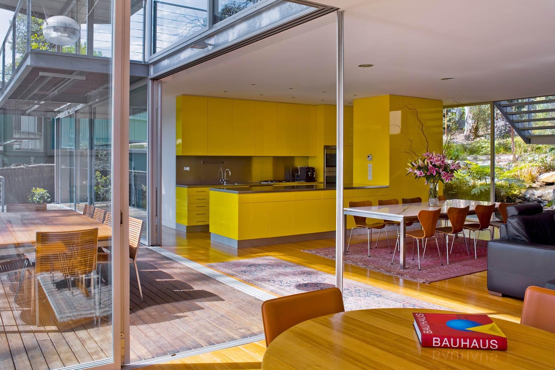 The western end of the house provides the adults living area and study/library with the dining area and distinctive vibrant yellow galley kitchen, polyurethane joinery and island bench. “It’s deliberately vibrant, contributing to the colourful landscape full of dense native trees and wildflowers in the adjacent bush,” says Lippmann. Another living area for the children, east of the kitchen is separable by a large recessed sliding doors. “The children needed their own space, as much as Tristram and Jane did,” adds Lippmann. On the floor above, the bedrooms rooms reflect the parent’s and children’s spaces below — practical for acoustic separation and providing a sense of “territory” for teenagers.