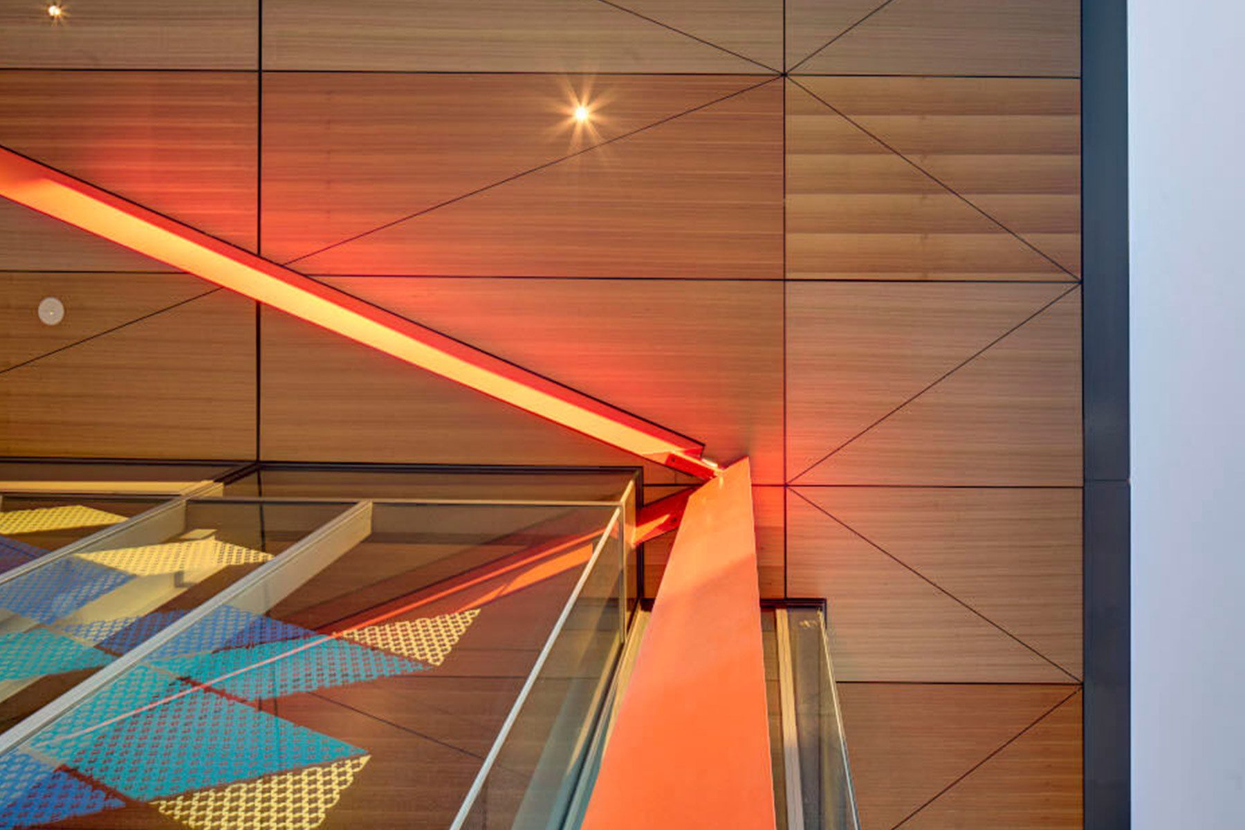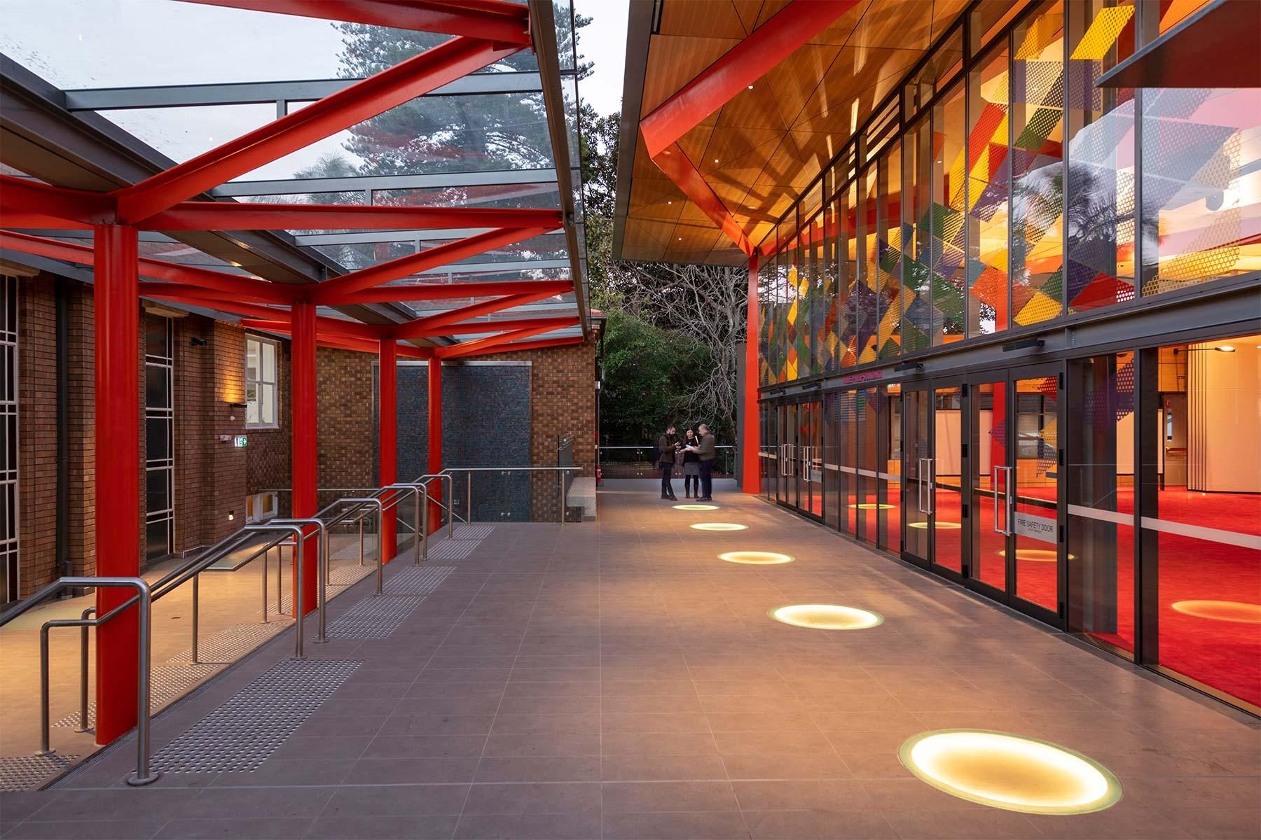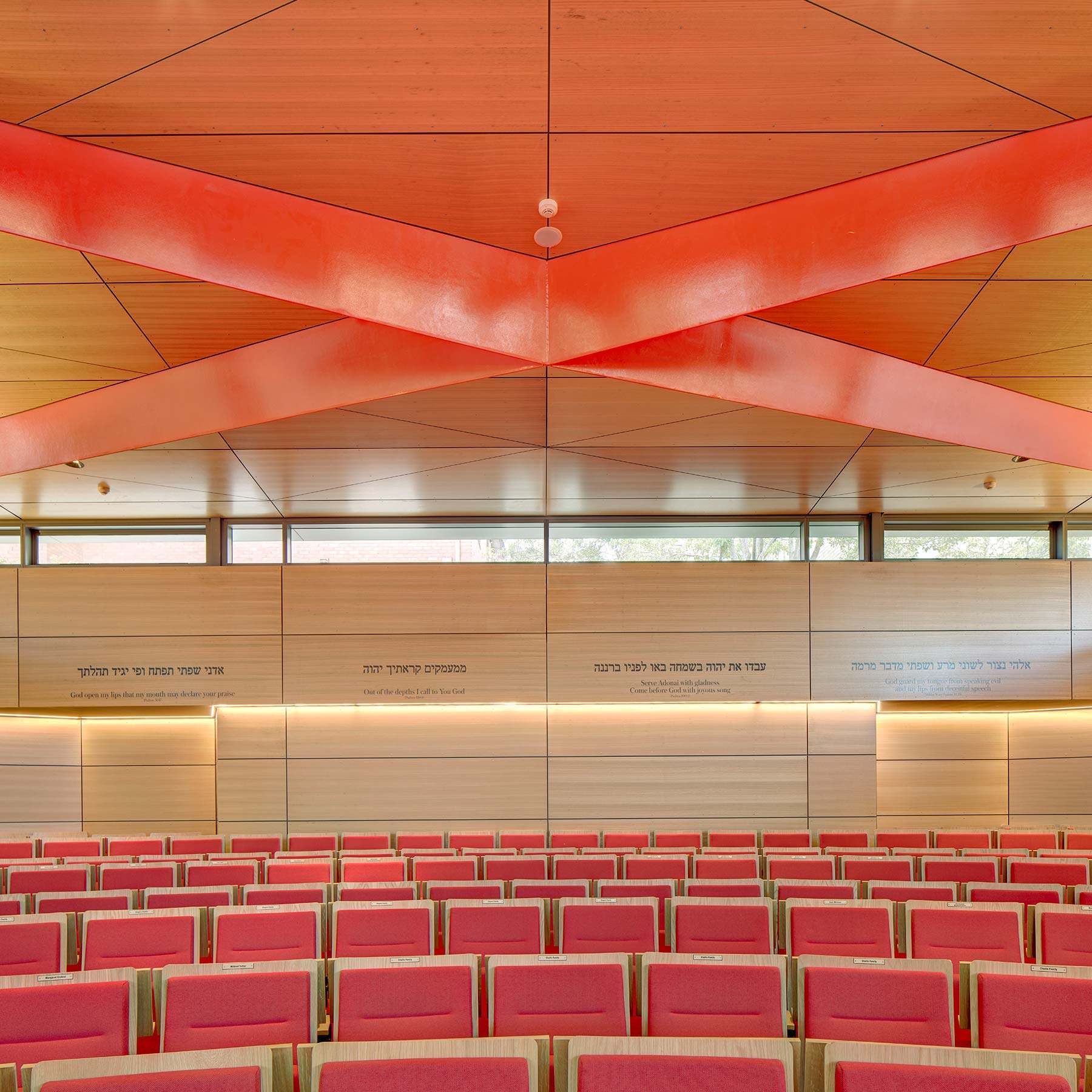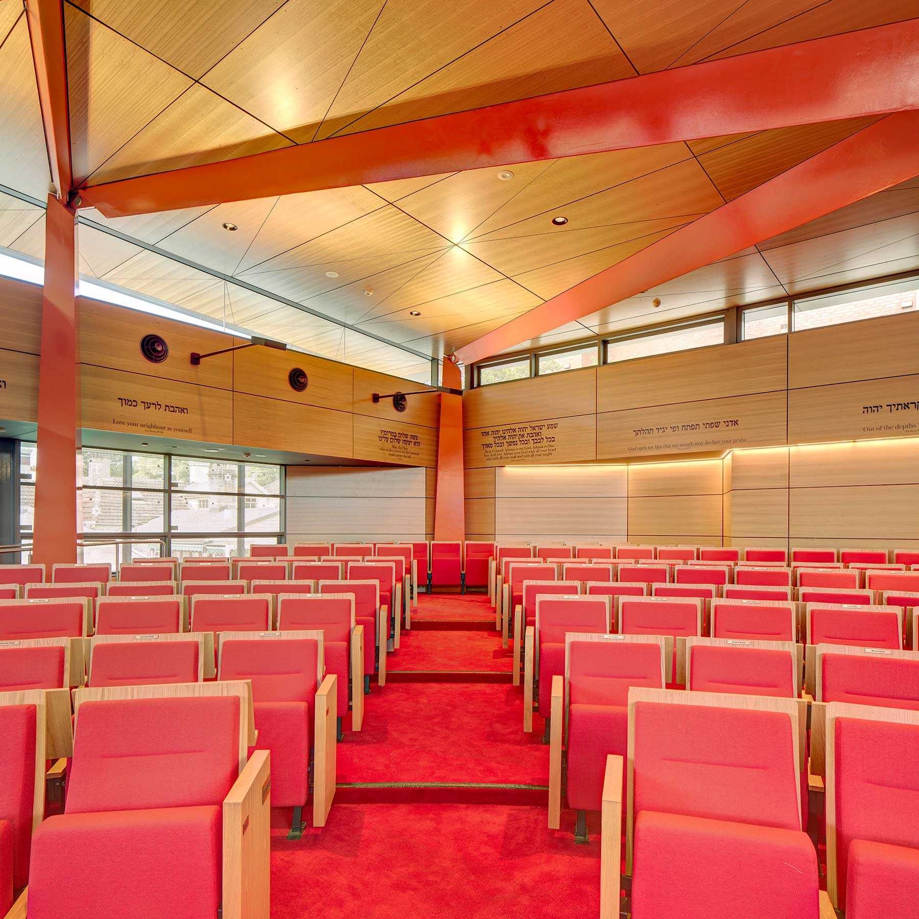 Ed Lippmann inherited the commission for the third sanctuary after a previous design by another architect proved well beyond the client budget. The new sanctuary needed to accommodate another 800 congregants. Lippmann‘s brief included “weaving” into the site the kindergarten and outdoor play area designed in the 1960s. Lippmann delivered an affordable, buildable rectangular form as a progression or journey through the front forecourt and main sanctuary lobby space. The size of the congregation fluctuates because full attendance only occurs on the three high holidays in the year, so the new sanctuary needed to provide for a variety of sizes as well as flexibility of uses — from traditional Hebrew services to new age gatherings led by acoustic guitarists and singers, lectures, films, functions and concerts. The Australian Chamber Orchestra led by eminent violinist Richard Tognetti perform in the space regularly and require high standards of acoustic performance. The need for flexibility and operability of the space came with high expectations from the congregation.