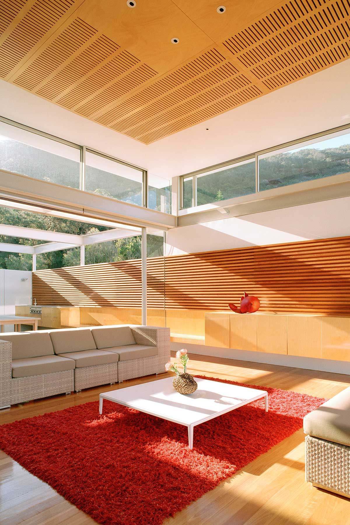The house was designed for a professional couple based in Sydney with who’d seen a number of houses previously designed by Lippmann. “They wanted a beach house, rather than an urban abode, that was casual, robust and low maintenance,” says architect Ed Lippmann. To the north was a breathtaking natural escarpment while to the east was the unimpeded water views. “I wanted to create a sense of being totally enveloped in this unique location, creating an entirely private enclave,” says Lippmann. So, from the street, as well as on the elevations bordering the neighbours, there are few, if any, windows, with fibre cement walls evocative of the Australian beach house vernacular.